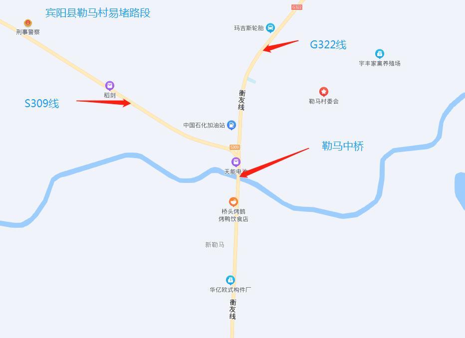 (二)G322線K2006+300~K2007+300賓州鎮(zhèn)勒馬村過(guò)境路段全長(zhǎng)1公里,該路段為國(guó)道322線與省道309線交匯點(diǎn),該路段機(jī)動(dòng)車平均日交通量達(dá)到18275輛/日,交通流量大,私家車、大中輕型貨車、摩托車和電動(dòng)自行車混合交通,通行緩慢,易造成擁堵,建議過(guò)往車輛減速緩慢通過(guò)或繞行上橫高速。