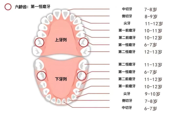 牙齒分為乳牙和恒牙,從6-7歲開始,兒童就開始“換牙”,“六齡齒”是指第一恒磨牙,在最后一顆乳牙的后面長出,上下左右各有一顆,正是因?yàn)槠湓诤⒆?/span>6歲左右萌出,所以習(xí)慣稱為“六齡齒”。